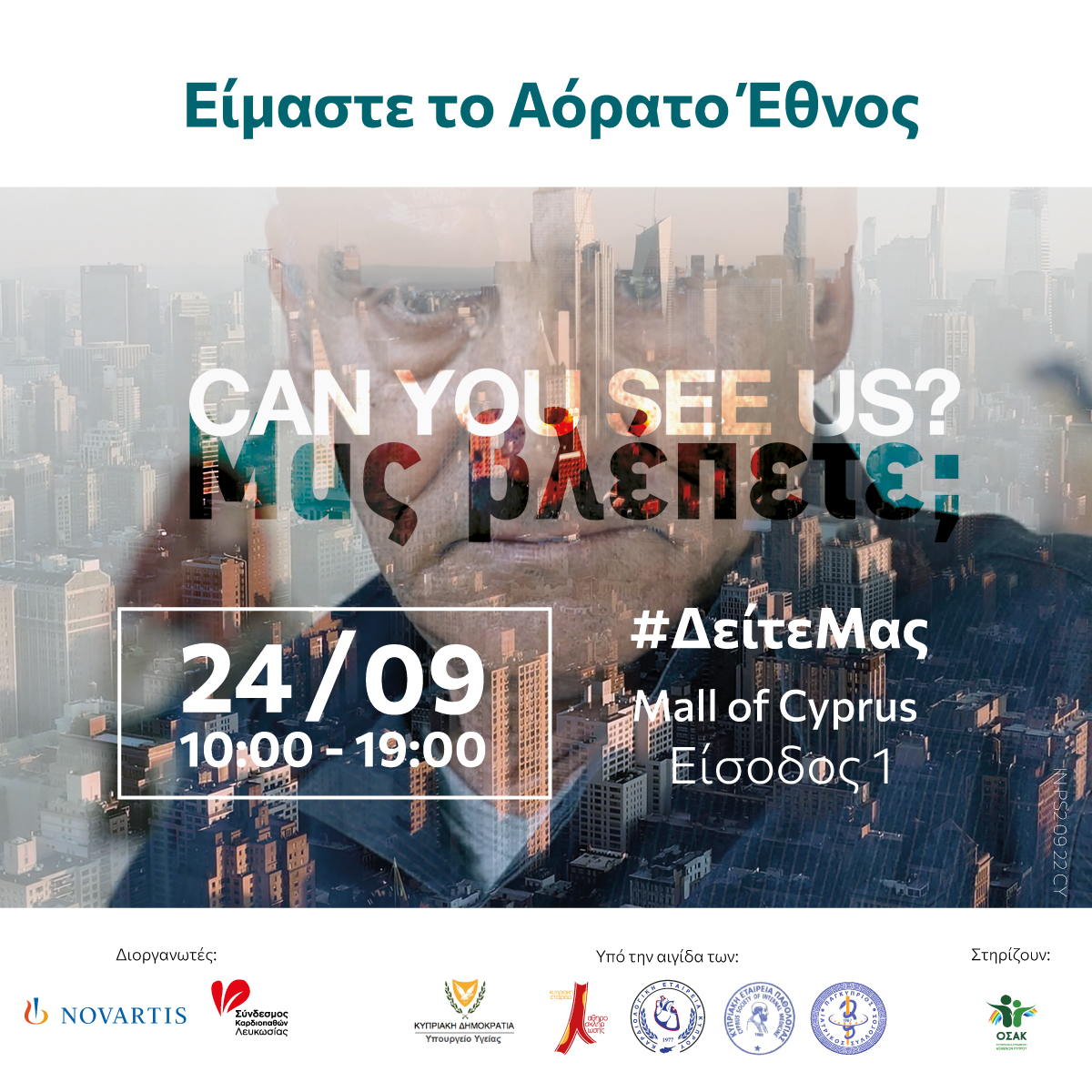 24 Σεπτεμβρίου στις 10:00-19:00 στο Mall of Cyprus (Είσοδος 1), η Novartis Pharma Services Κύπρου σε συνεργασία με τον Σύνδεσμο Καρδιοπαθών Λευκωσίας (μέλος του Global Heart Hub) και τη στήριξη όλων των ενδιαφερόμενων εταίρων, της Κυπριακής Εταιρείας Αθηροσκλήρυνσης, της Καρδιολογικής Εταιρείας Κύπρου, της Κυπριακής Εταιρείας Παθολογίας, του Παγκύπριου Ιατρικού Συλλόγου και της Ομοσπονδίας Συνδέσμων Ασθενών Κύπρου σας καλεί στη σημαντική αυτή δράση που γίνεται υπό την αιγίδα του Υπουργείου Υγείας. #Δείτεμας #InvisibleNation